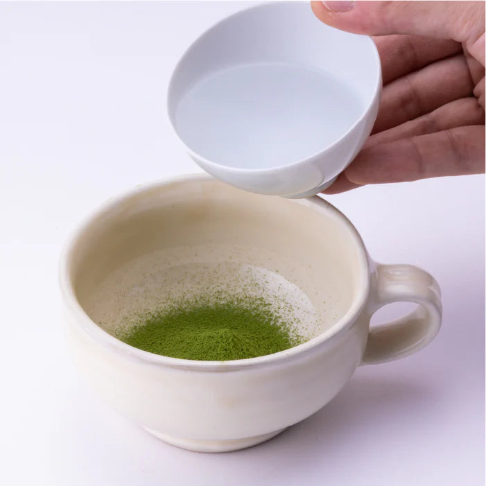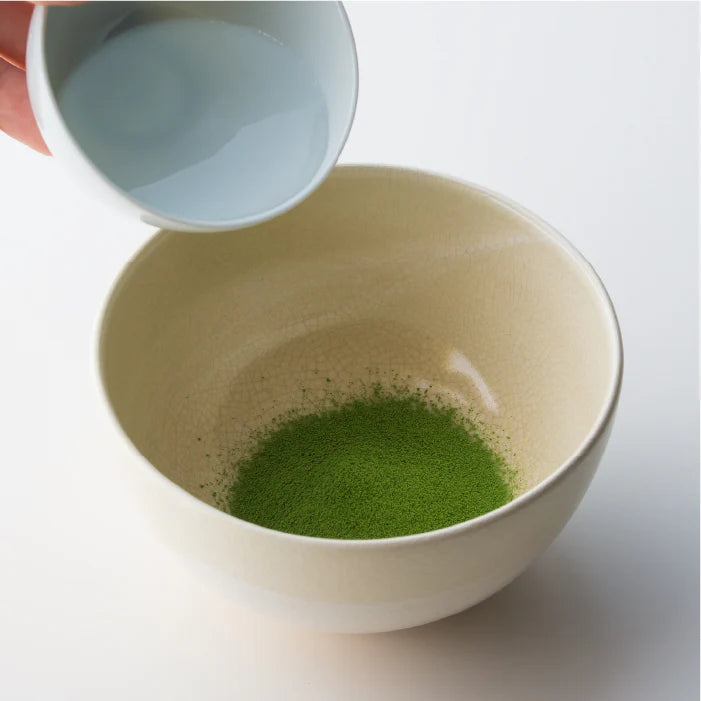 Step 2: Cool boiling water to 80°C (176°F) in teacup, then pour 30 ml (1 oz) into bowl, just covering matcha powder.